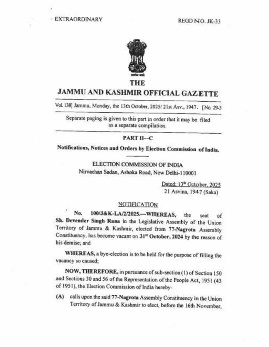 J&K Official Gazette Notification: Bypolls for Nagrota and Budgam Assembly Seats Jammu & Kashmir Gazette Notification: Bypolls Announced for Budgam & Nagrota Assembly Constituencies Election Commission Orders By-Elections The Election…